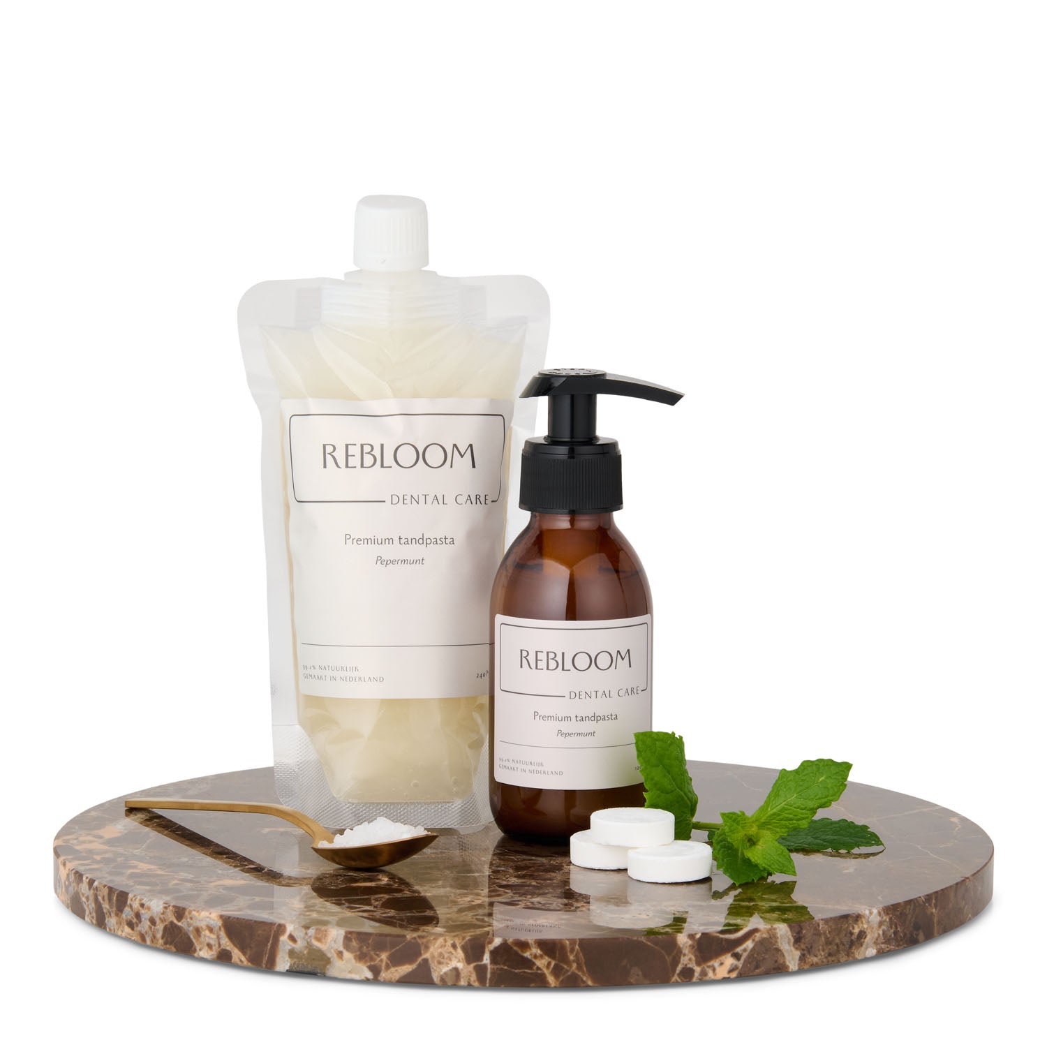 Deze starter set is speciaal samengesteld om zes tubes tandpasta te vervangen met de natuurlijke tandpasta van ReBloom Care. ReBloom Care zorgt voor stijlvolle routine waarbij gemak, gezondheid en duurzaamheid samenkomen. ReBloom Care tandpasta zorgt voor een frisse adem, sterk glazuur & gezond tandvlees.* ReBloom helpt de opbouw van tandplak en tandsteen tegen te gaan. Deze tandpasta heeft een frisse pepermuntsmaak met een subtiele zoute bite en zorgt voor een schoon en fris mondgevoel.